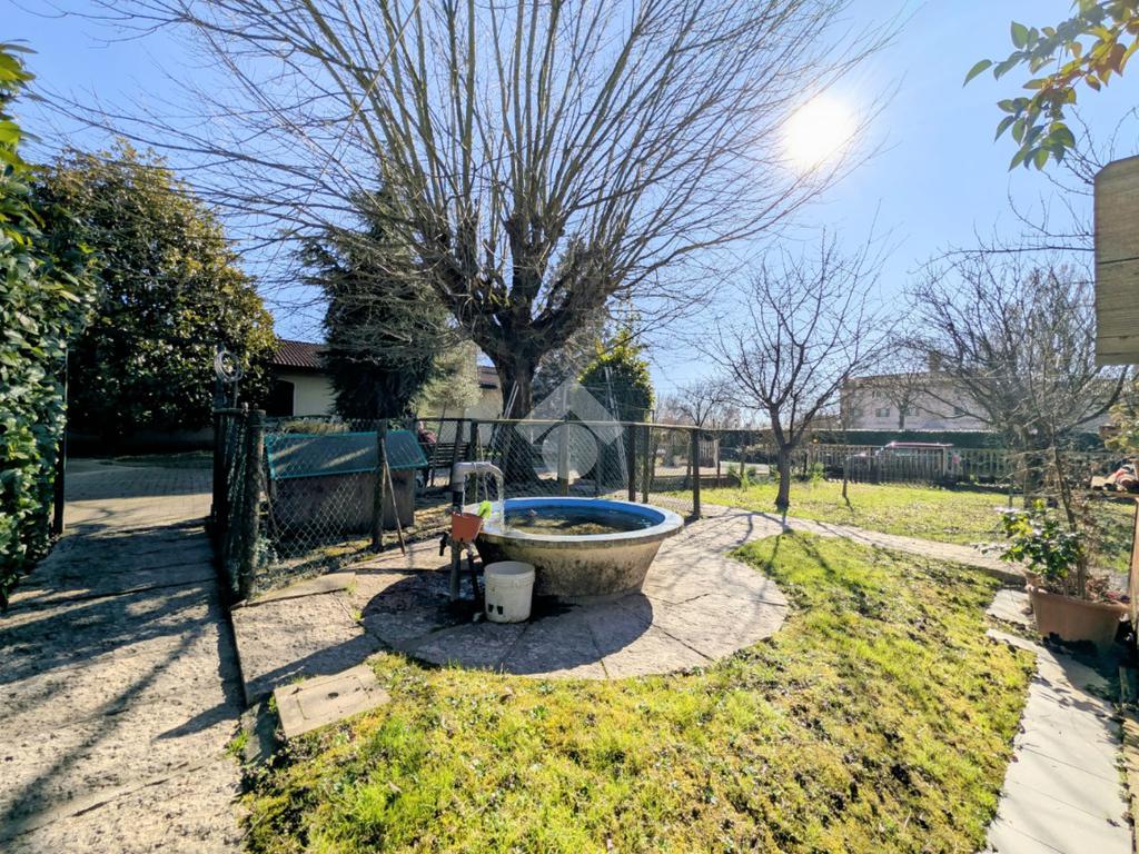 All’esterno si estende un ampio giardino piantumato di 1500 mq ca. con l’accesso carraio e box auto.