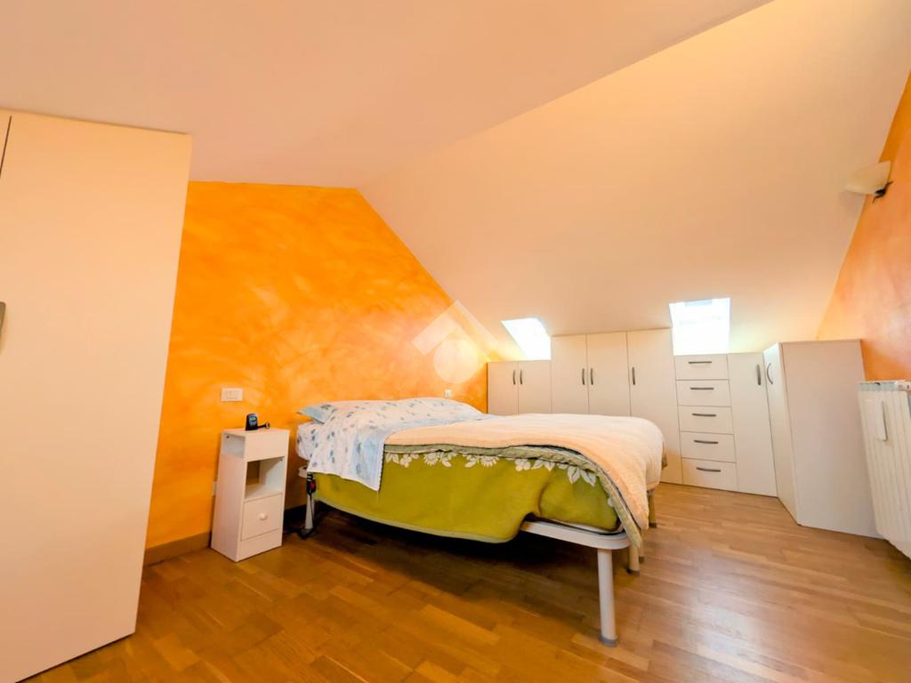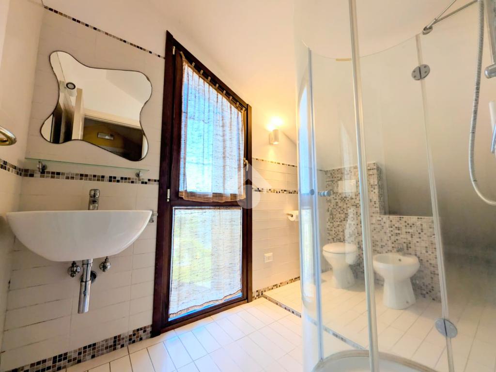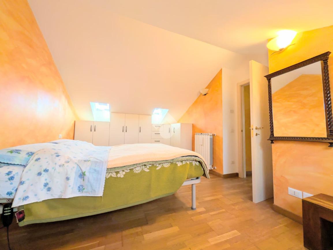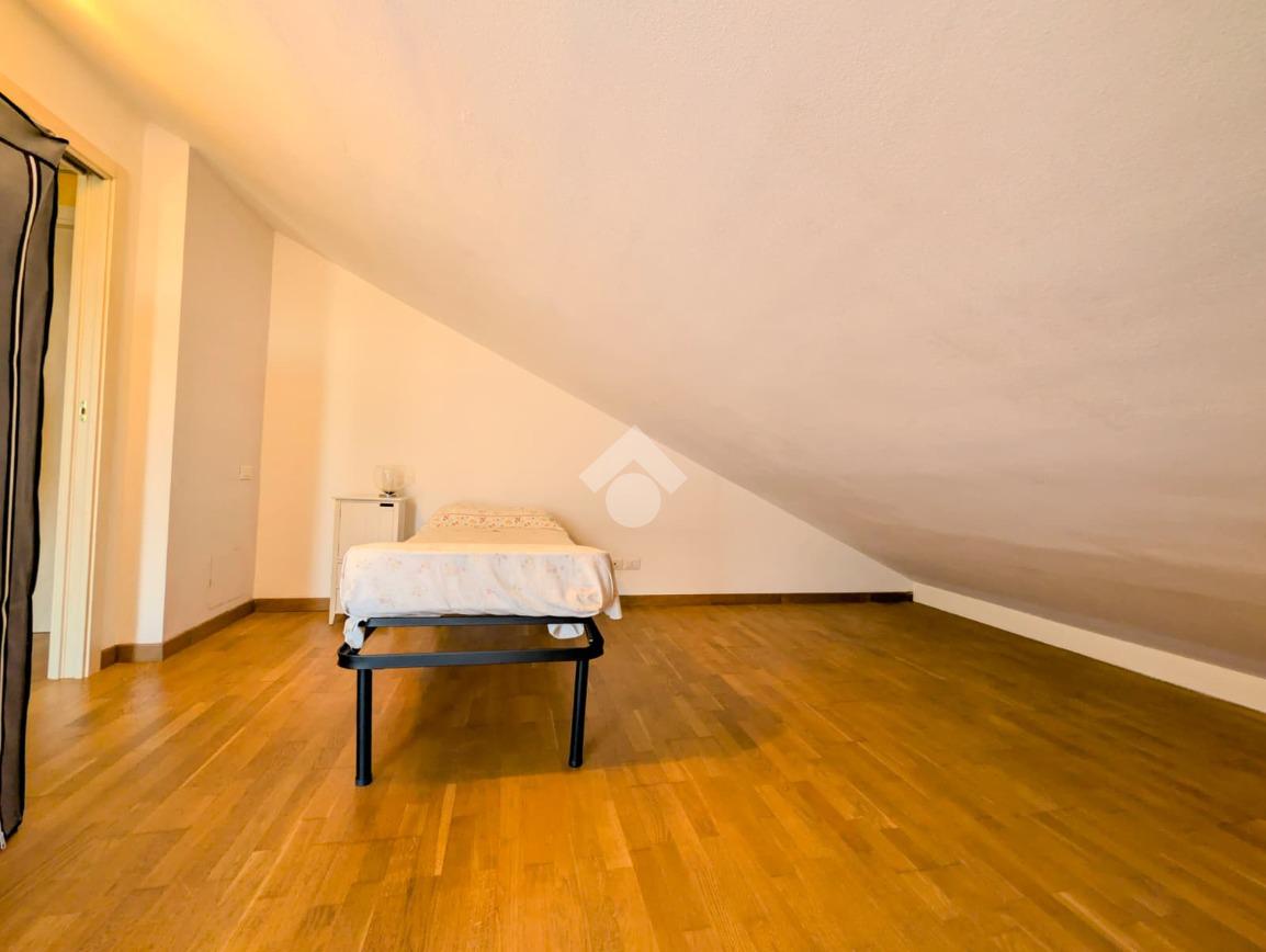 Tramite una scala in legno saliamo al secondo livello della casa che ospita un sottotetto dalle grandi dimensioni dove attualmente sono stati ricavati una camera da letto e un ripostiglio molto ampio. Anche questo piano è dotato di un bagno finestrato con doccia.